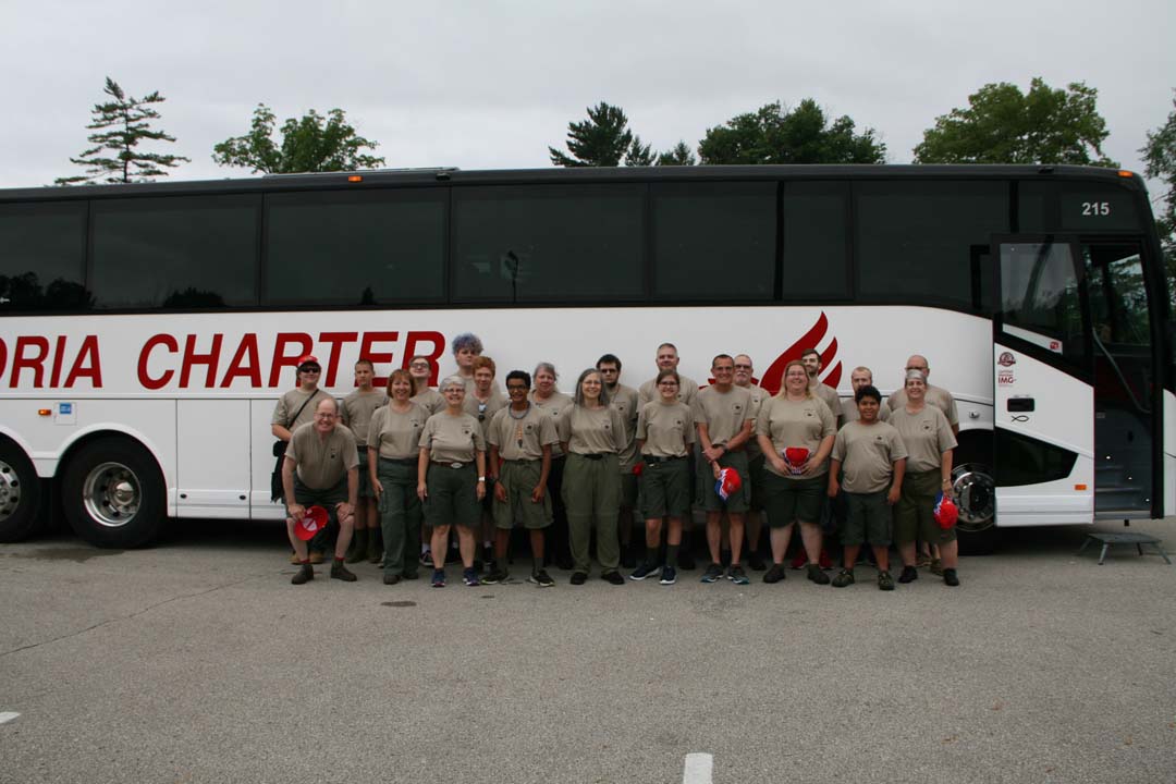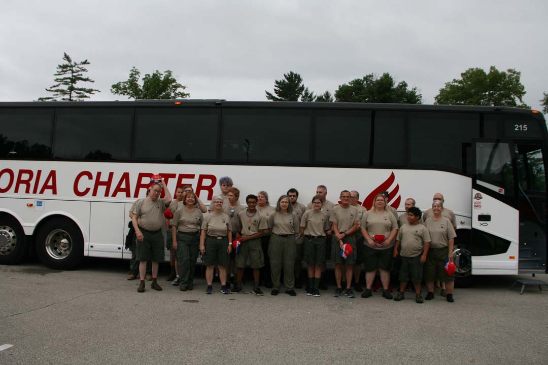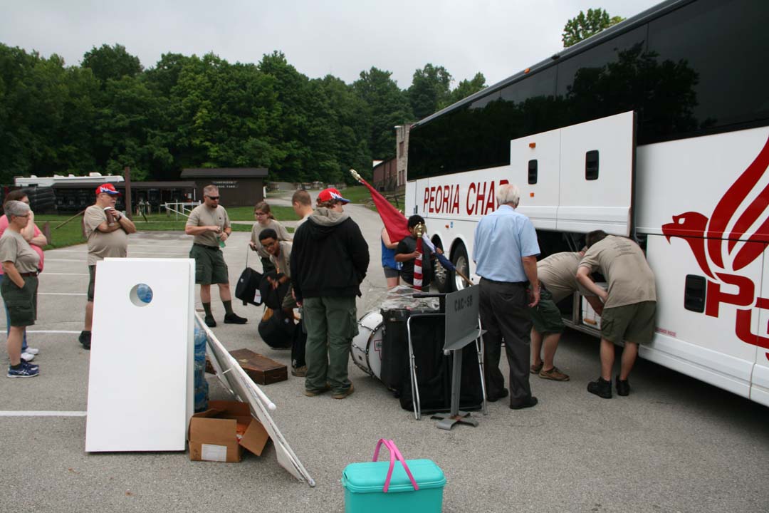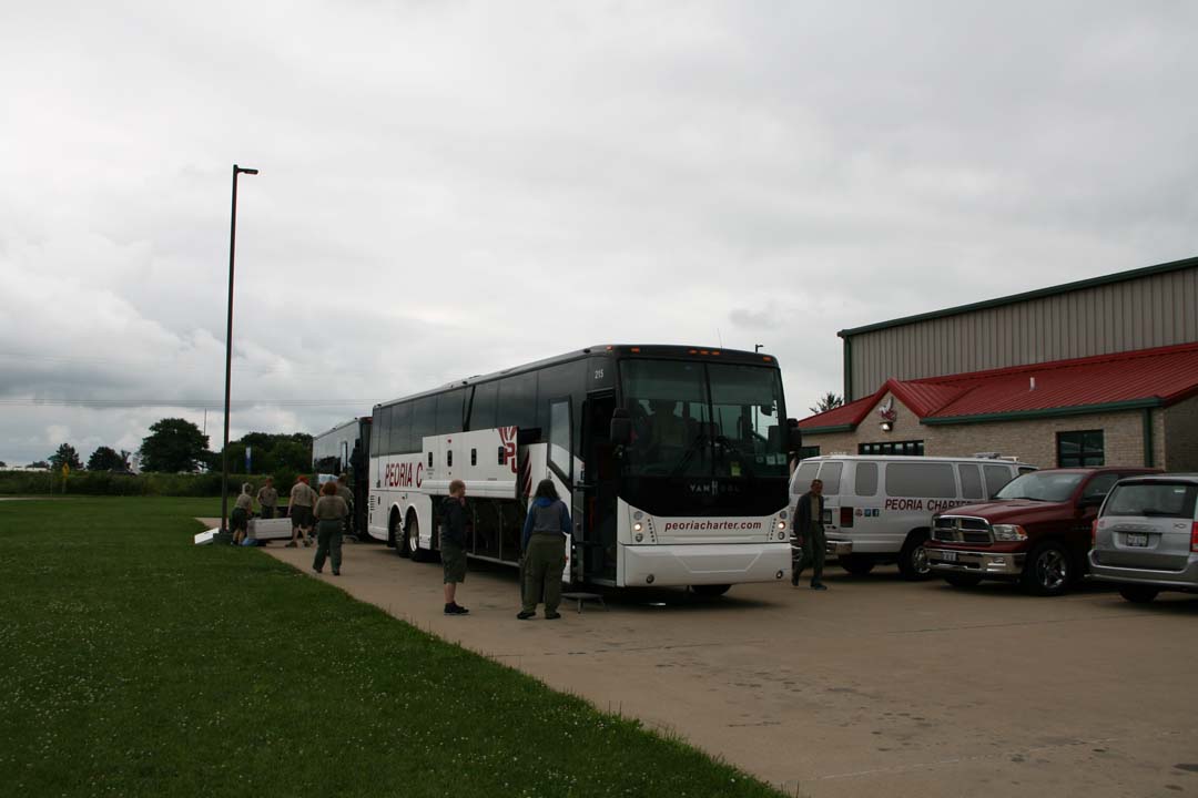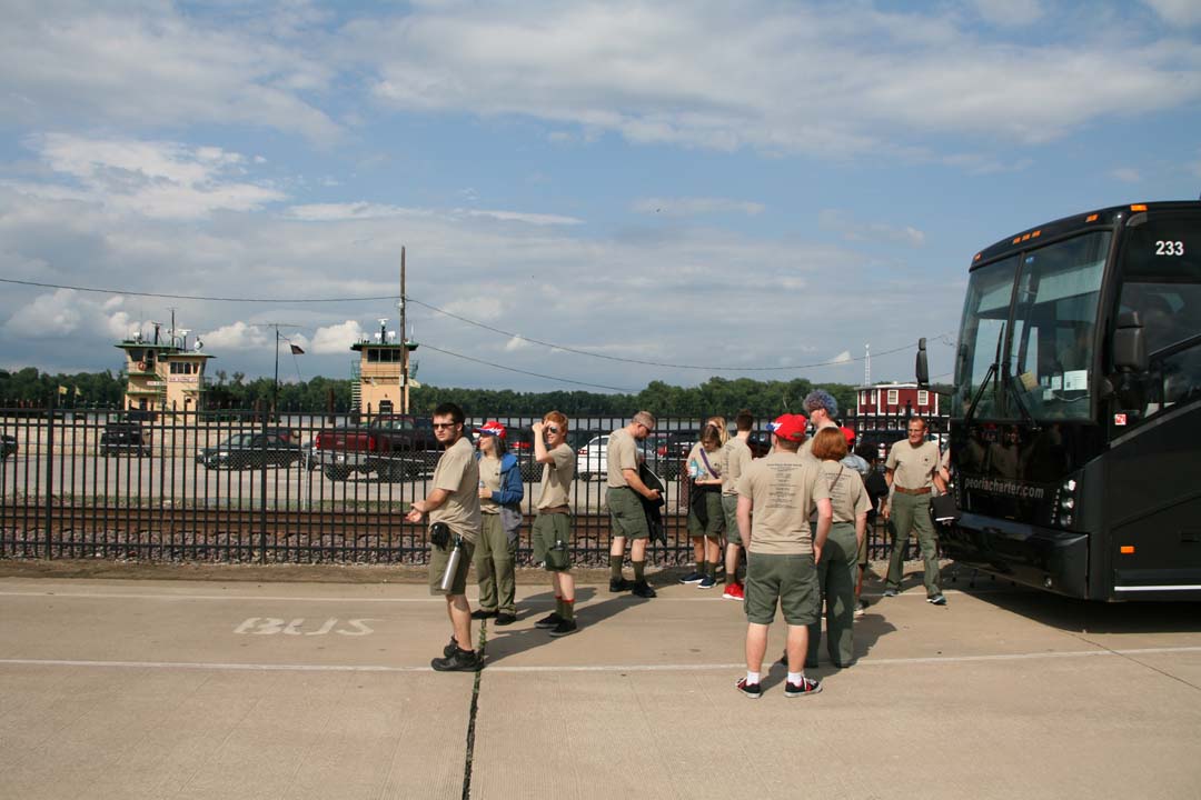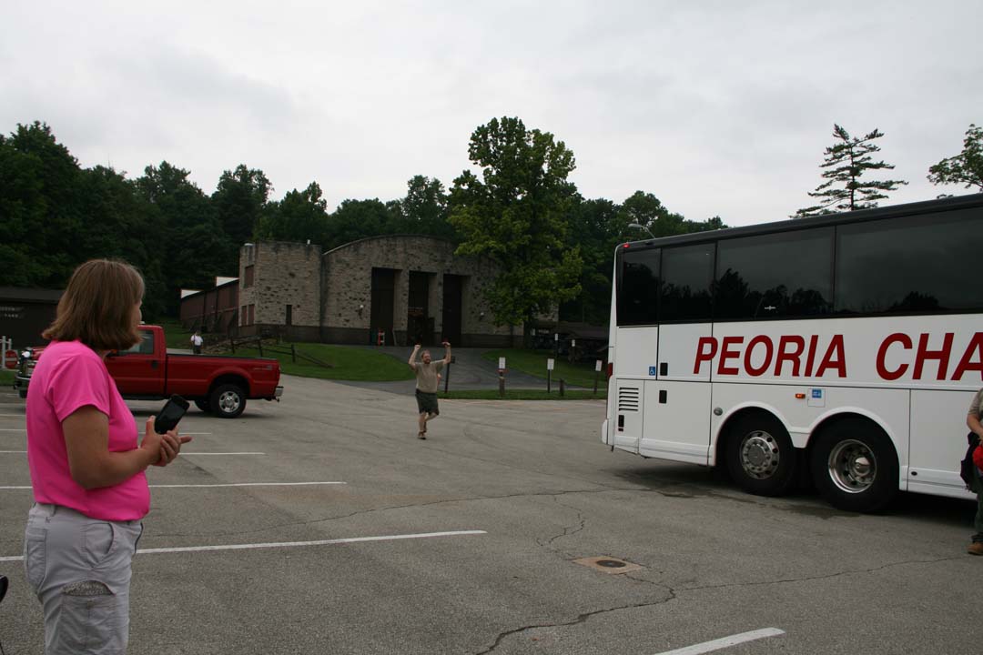 The first day we were scheduled to leave Camp Belzer early in the morning only to break down before we got off of Boy Scout Road. Yet again, we suffered a bus malfunction. Evidently, the brakes were hanging up and would not let the bus go normally. We take out our sack lunches to eat lunch in the baseball stands behind Lawrence Central High School. A road mechanic stopped in and made a quick adjustment to fix the problem. Just before noon, the bus was working again and we were back on the road headed to Hannibal, Missouri. Later in the afternoon we stop in at the bus shop in Urbana, Illinois to exchange buses. Then around 5 pm we arrived at Hannibal river front to watch our Dinner Cruise River Boat arrive at the Landing. We took a little time to explore the Hannibal History Museum which was close by, then we boarded the "Mark Twain" for our dinner cruise. The crew was delighted with a full menu of food and a band named "The River Men" that played for us while we ate.